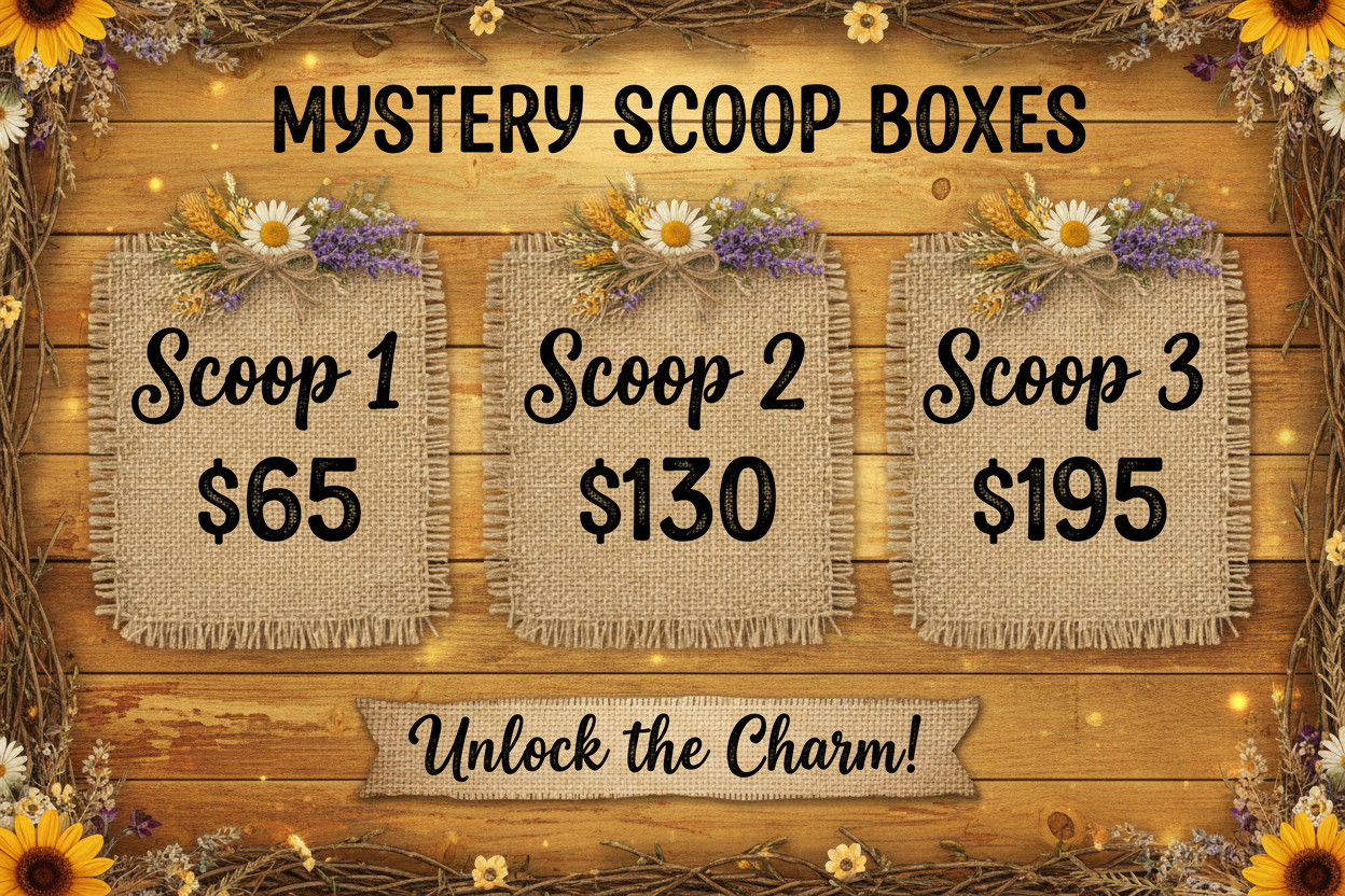 Every mystery scoop is crafted with love and Southern hospitality. We believe in the magic of surprise and the joy of discovering handpicked treasures that bring warmth to your home. From rustic farmhouse finds to charming country keepsakes, each box tells a story of tradition, quality, and heartfelt care.